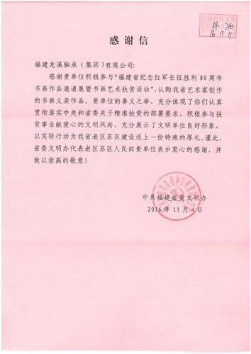 近日,一封感謝信寄到了公司。原來,為感謝公司積極參與“福建省紀念紅軍長征勝利80周年書畫作品邀請展暨書畫藝術扶貧活動”,認購我省藝術家書畫義賣作品,為我省老區蘇區建設貢獻一份力量,省委文明辦特意寄來了這封感謝信。