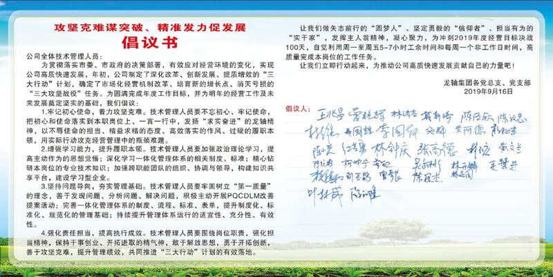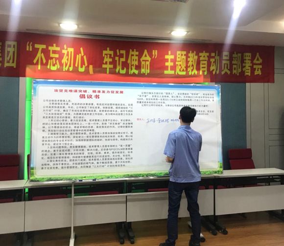 2019年9月16日,公司各黨總支、黨支部在二樓會議室開展 “攻堅克難謀突破、精準發力促發展”倡議書簽名活動。航空事業部黨支部書記王兆昌代表公司各黨總支、黨支部向全體技術管理人員發出倡議:一要牢記初心使命,著力攻堅克難;二要增強學習能力,提升履職本領;三要堅持問題導向,夯實管理基礎;四要強化責任擔當,提高執行成效。號召全體技術管理人員做矢志前行的“圓夢人”、堅定勇毅的“信仰者”、擔當有為的“實干家”,發揮主人翁精神,凝心聚力,為沖刺2019年度經營目標決戰100天,自覺利用周一至周五5-7小時工余時間和每周一個非工作日時間,高質量完成本崗位的工作任務。最后,各黨總支(支部)書記依次在倡議書上簽字。