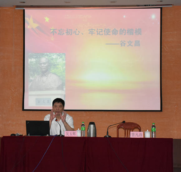 ????2019年9月23日上午,公司黨委書記、董事長曾凡沛在俱樂部會議室主持召開第二場 “不忘初心、牢記使命”主題教育集中學習研討會,邀請中共中央黨校特約研究員、中國作家協會會員吳玉輝講授《“不忘初心、牢記使命”的楷?!任牟?,公司領導、各黨總支、黨支部書記及支委、中層干部及主題教育領導小組辦公室成員參會。