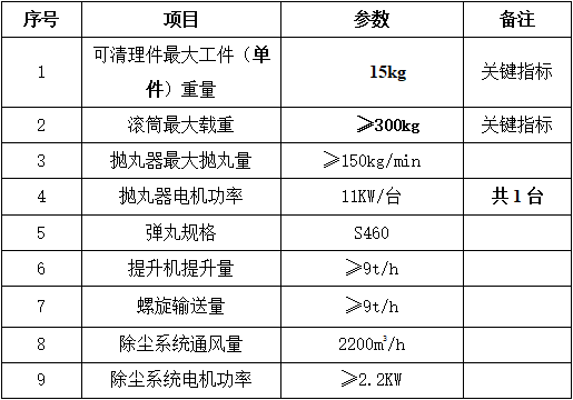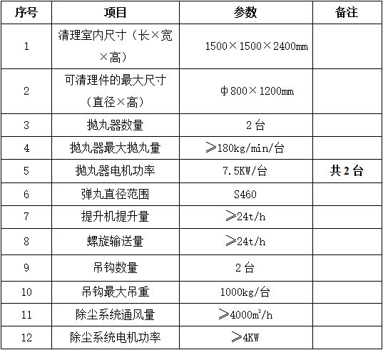 2.2功能、結構須滿足如下要求:該設備主要由吊鉤輸送系統(tǒng)、清理室體、拋丸器、提升機、維修平臺、分離器、螺旋輸送器、底部料斗、除塵系統(tǒng)、電控系統(tǒng)等組成。
