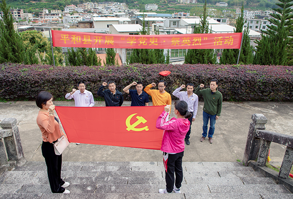 在平和暴動(dòng)烈士紀(jì)念碑前,紅旗黨總支書記林玉應(yīng)率全體人員向烈士紀(jì)念碑敬獻(xiàn)花籃,然后帶領(lǐng)全體黨員重溫入黨誓詞,回望入黨初心,接受心靈的凈化和洗禮。緊接著,在講解員羅燕軍的帶領(lǐng)下,大家參觀了平和暴動(dòng)紀(jì)念館,聆聽了平和暴動(dòng)歷史及朱積壘等烈士的故事。