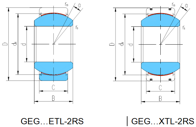 可提供密封圈為“2GS”和不帶密封圈的向心關節軸承。