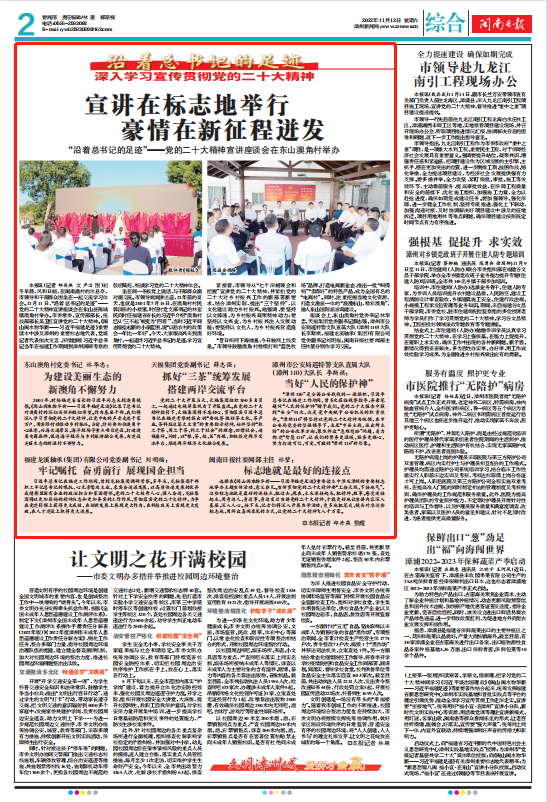 本報訊(記者 邱丹燕 文 嚴潔 圖)初冬早晨,風和日麗,在閩南漁村的休息亭,市領導和干部群眾圍坐在一起交流學習體會。11月11日,“沿著總書記的足跡”——黨的二十大精神宣講座談會在東山縣陳城鎮澳角村舉辦。市委常委、宣傳部部長、統戰部部長吳衛紅宣講黨的二十大精神。《閩山閩水物華新——習近平福建足跡》重要讀本中涉及漳州的重要標志地代表、黨媒記者代表依次發言,深情回顧習近平總書記當年在福建工作期間到漳州調研考察的殷切囑托,暢談學習黨的二十大精神體會。