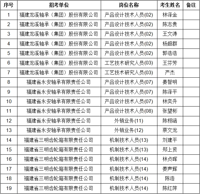 根據《福建龍溪軸承(集團)股份有限公司2023年秋季公開招聘公告》有關規(guī)定,經面試等程序,現(xiàn)將集團本部及權屬企業(yè)(福建省永安軸承有限責任公司、福建省三明齒輪箱有限責任公司)擬聘用人員予以公示,公示期為5個工作日,公示名單如下:
