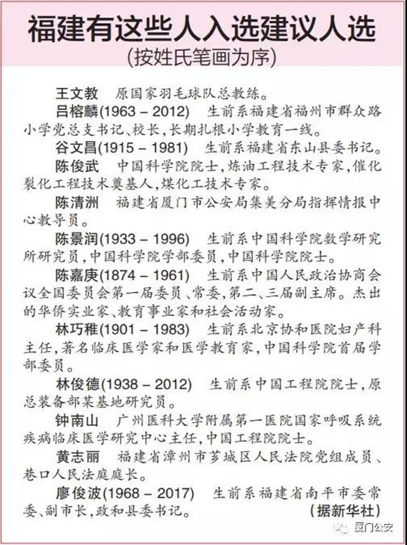 ????在前期的遴選推薦、群眾網上投票、組委會集中審議、中央和國家機關有關部門認真審核下,組委會于9月15日公示了300名“最美奮斗者”建議人選名單。其中,“時代楷?!薄⑷珖蚕到y一級英模、廈門市公安局民警陳清洲和漳州市薌城區人民法院黨組成員、巷口人民法庭庭長黃志麗榜上有名。同時,福建共有12人入選建議人選名單。