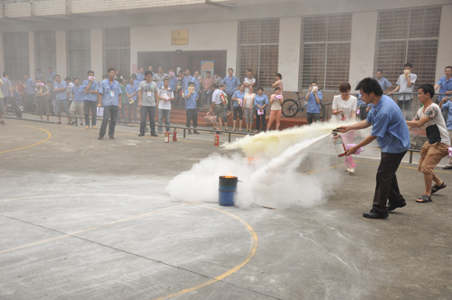 緊接著指揮人員讓參加演練的人員在一樓籃球場集中,闕教官現(xiàn)場講解和演示用干粉滅火器滅火的要領(lǐng),并讓參演人員使用干粉滅火器進行現(xiàn)場滅火體驗。演練結(jié)束后,環(huán)境與安全管理部人員就本次演練活動進行了分析和小結(jié)