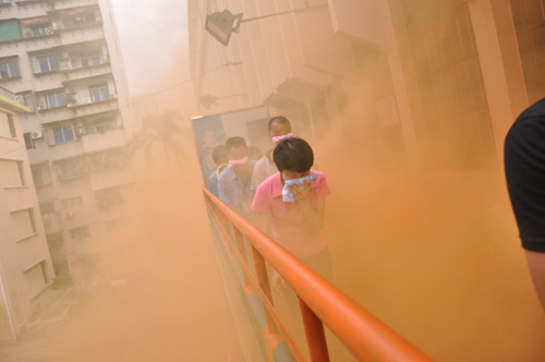 在闕教官講解相關(guān)消防知識和消防器材使用方法、傳授消防逃生應(yīng)變技能和自我保護技能及明確各演練職能小組職責和演練小組疏散路線之后,演練開始。滅火行動組在得到演練命令后,立即發(fā)出火警訊號,并在各指定點放啟煙霧彈,樓梯道和走廊瞬間頓時濃煙滾滾。各演練組聽到逃生訊號后,在應(yīng)急疏散隊的組織下,按組分批迅速有序地從俱樂部二樓往一樓籃球場疏散撤離,每人用濕毛巾捂住嘴巴,彎腰匍匐前進,按規(guī)定的順序疏散,直到?jīng)_出煙區(qū)。