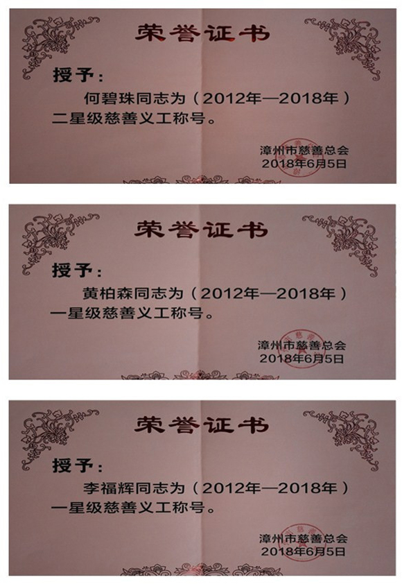 2018年6月5日,首屆漳州市星級慈善義工分隊、星級慈善義工授星儀式在漳州市慈善總會舉行,公司何碧珠同志榮獲二星級慈善義工稱號,黃柏森同志和李福輝同志榮獲一星級慈善義工稱號。公司義工分隊自2012年成立以來,圍繞“志愿、無償、友愛、互助”的服務精神,在扶貧濟困、安老扶幼、助學助醫、社區服務、慈善宣傳等方面積極開展志愿服務活動,為建設美麗、富裕、幸福漳州做出了龍軸貢獻,充分體現了公司做為全國文明單位在履行社會責任、推進幫扶工作的示范帶頭作用。